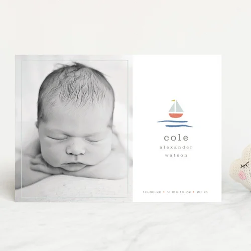 Birth announcement featuring a small sailboat on the open ocean