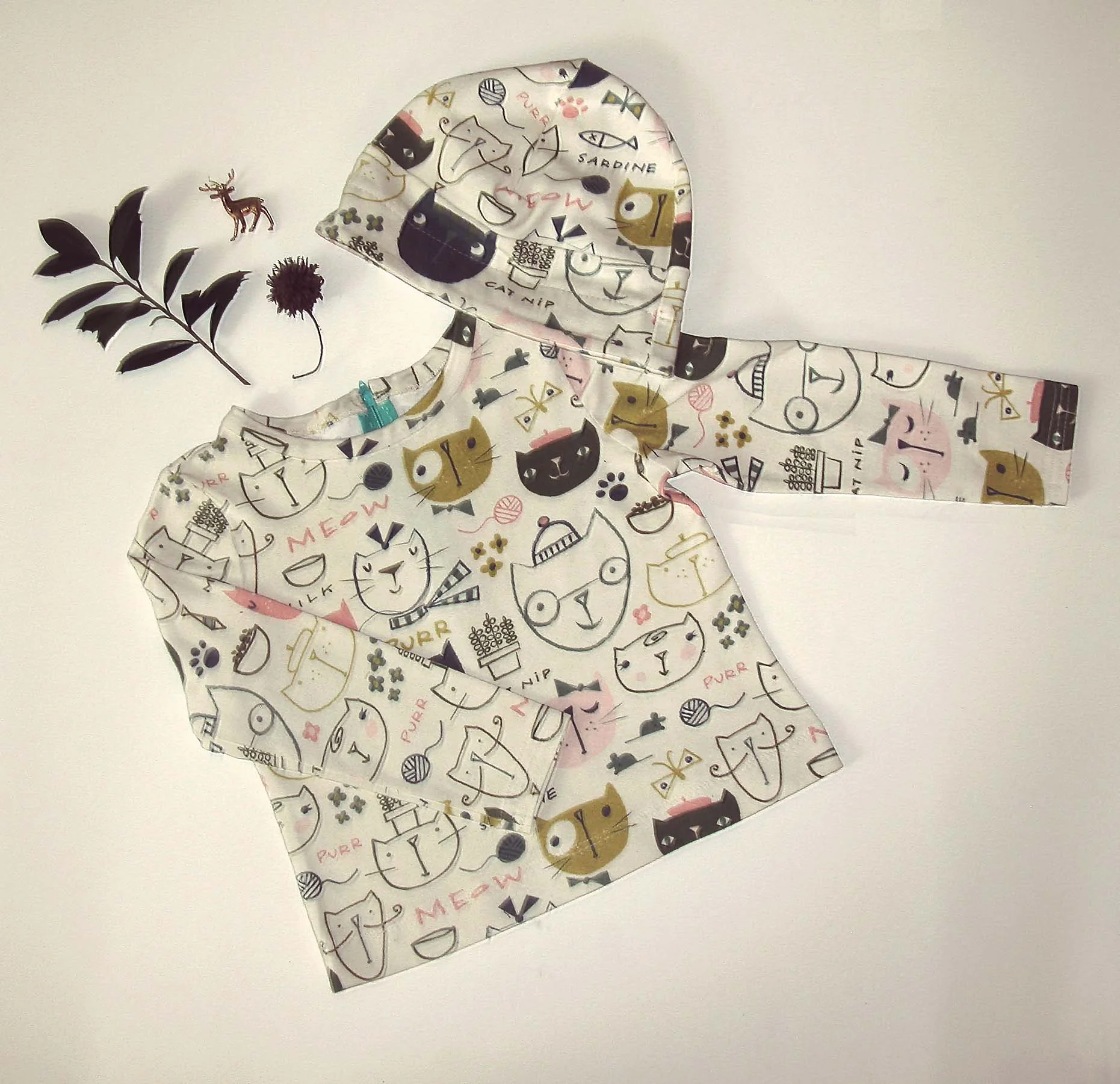 I love it when people send me photos of items they make with my fabric—especially since I don't know how to sew very well. Pat Donovan (aka Chickoteria) forwarded this darling baby tee and hat she created with my Here Kitty, Kitty fabric from Spoonflower. Perfect for her tiny niece. And I love how she styled the photo for Fall, too!